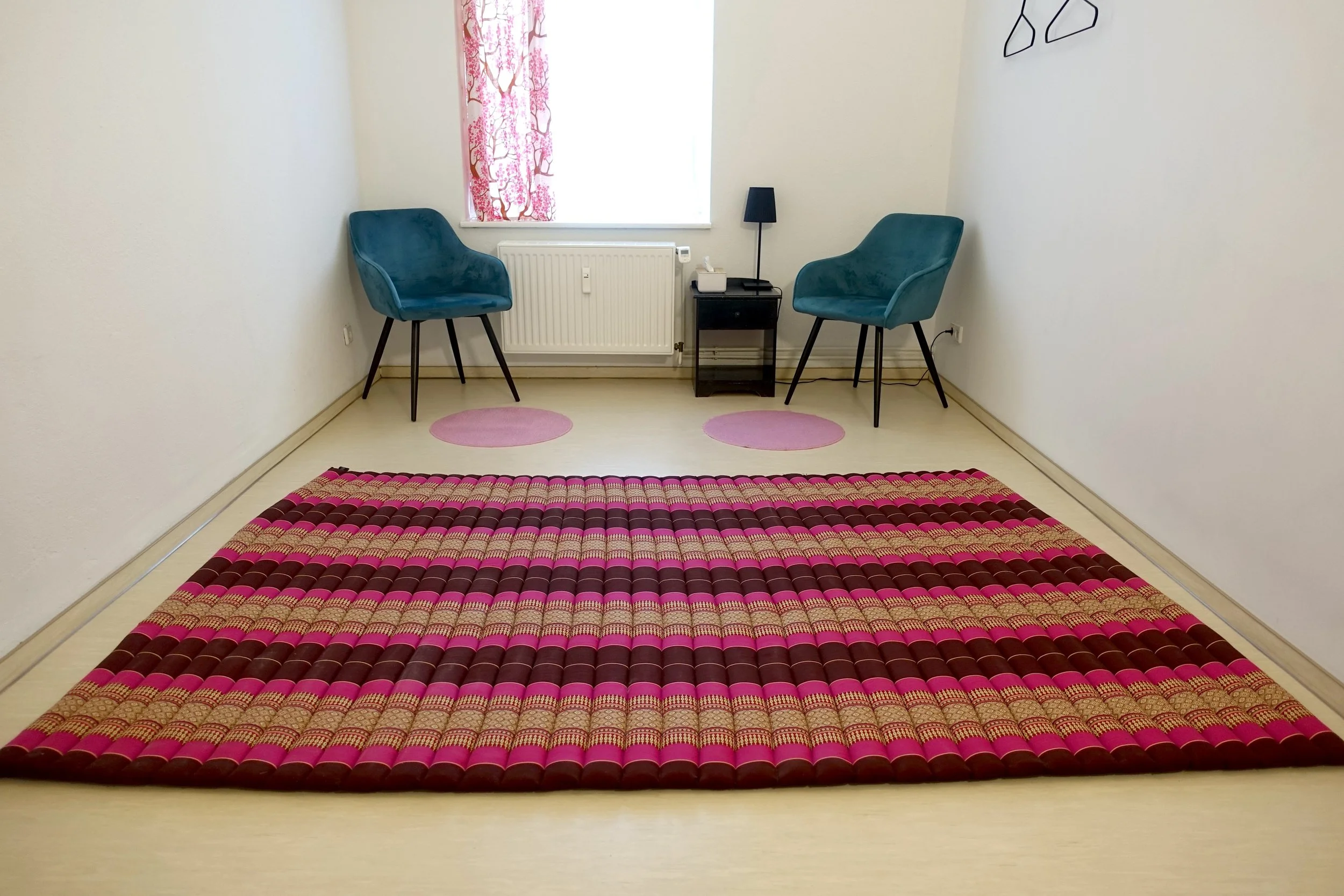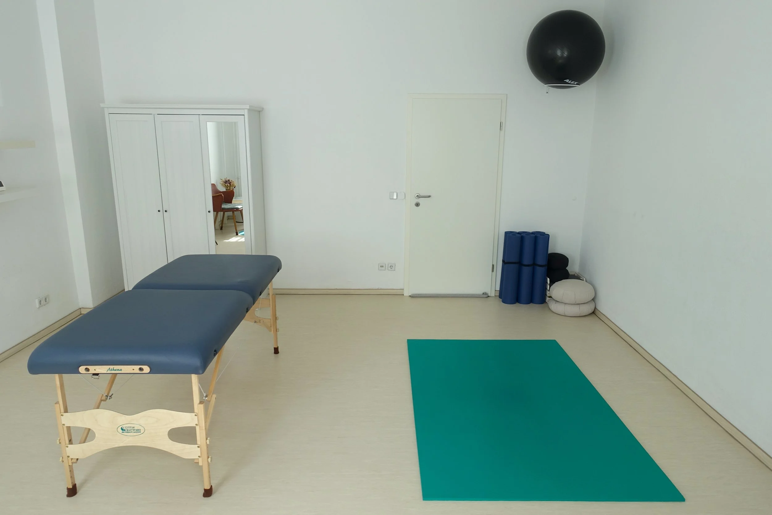 Equipped with: yoga mats, a large Pilates mat, a massage table, a bluetooth speaker, massage sheets and various bolsters and pillows